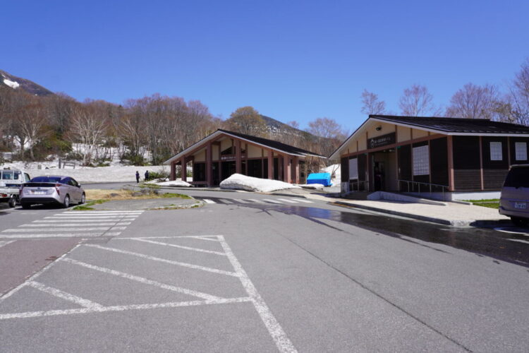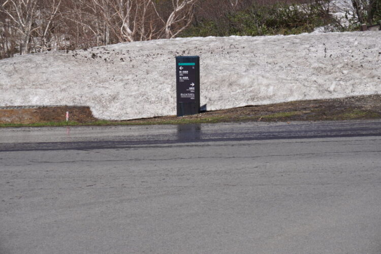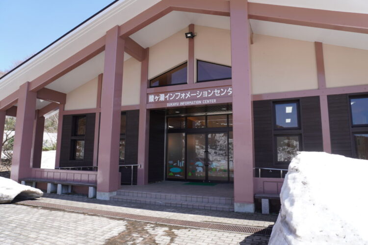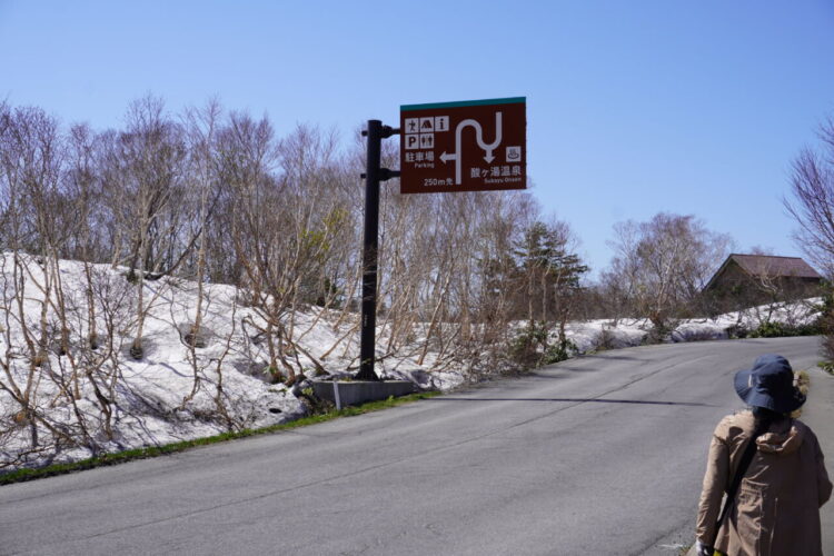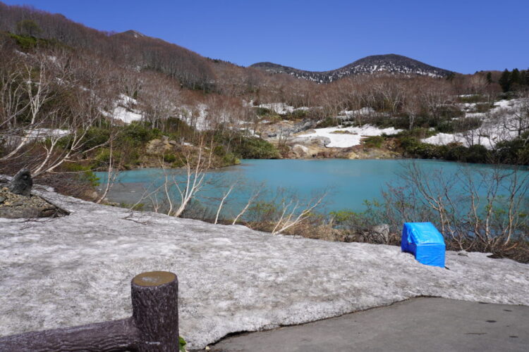 酸ヶ湯温泉から徒歩5分程のところにある地獄沼は、かつての爆裂火口跡に近くから湧き出る温泉水がたまってできた沼だそうです。付近には火山活動のなごりの噴気口がいくつかあり、硫黄を多く含んだガスや温泉が噴出しているそうです。沼の中は魚が生息できない強酸性で、90℃の熱湯が湧き出しており、沼に立ち入ることはできません。もうもうと立ち込める湯気と硫黄臭は、まさに地獄さながら。草や木が生えない荒涼とした景色が広がっています。酸ヶ湯インフォメーションセンターに車を止め、歩いて地獄沼に行きました。