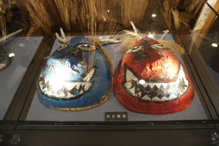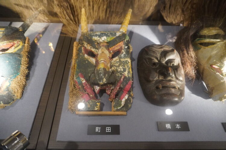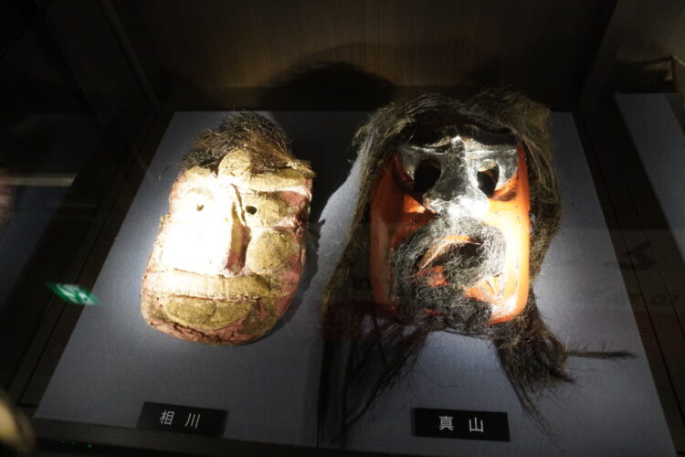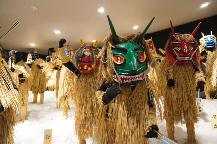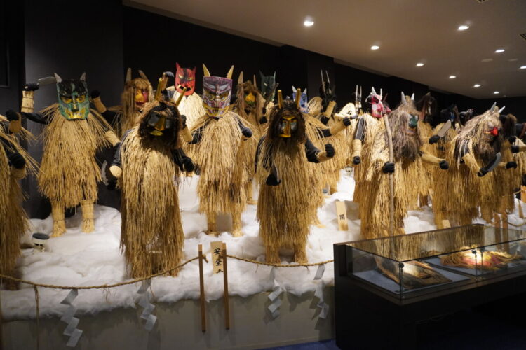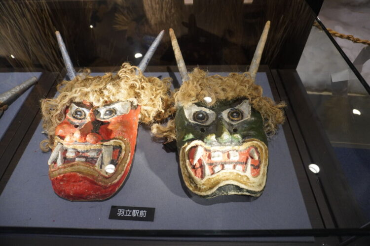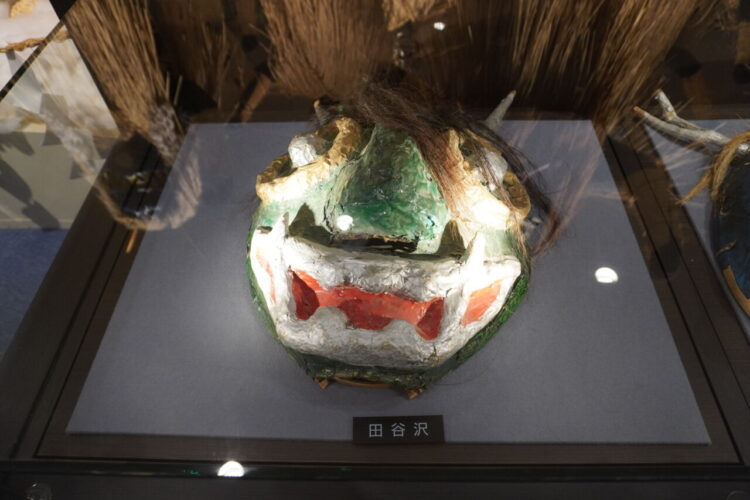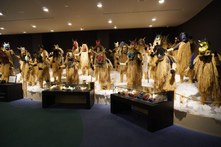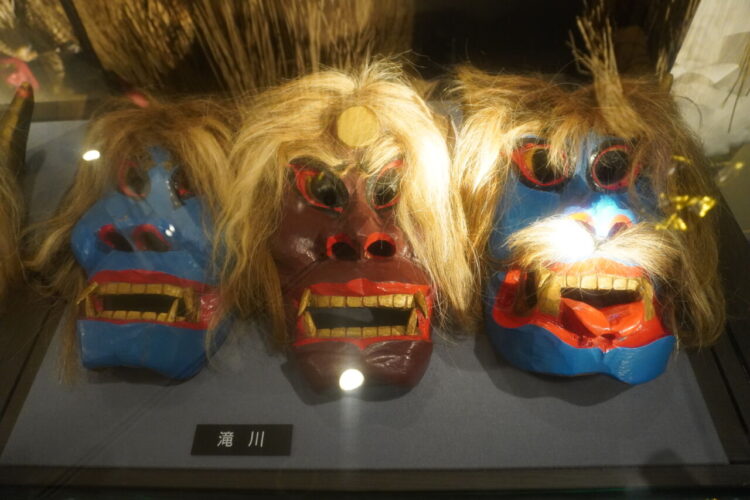 なまはげの面が展示されていました。男鹿市内60ほどの集落で実際に使われてきたお面が展示されており、ショーケースのものも合わせるとその数なんと150にのぼるそうす。