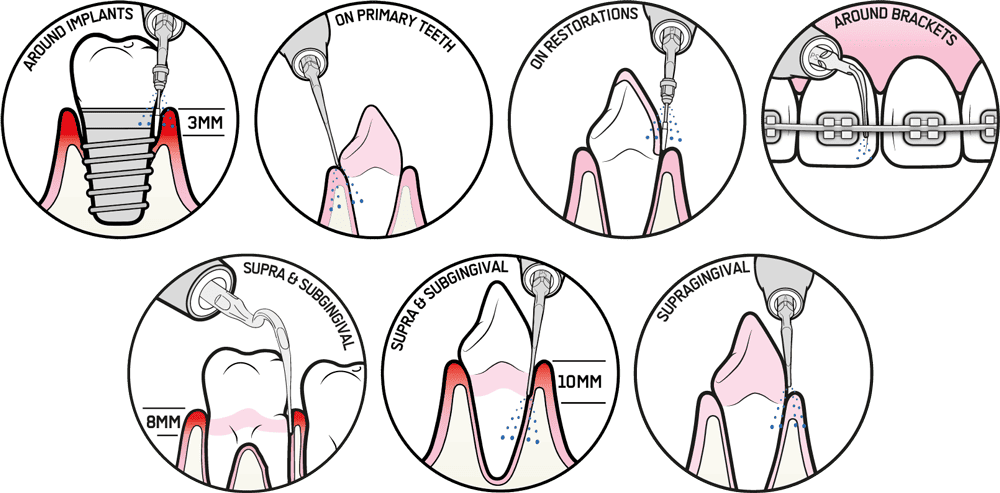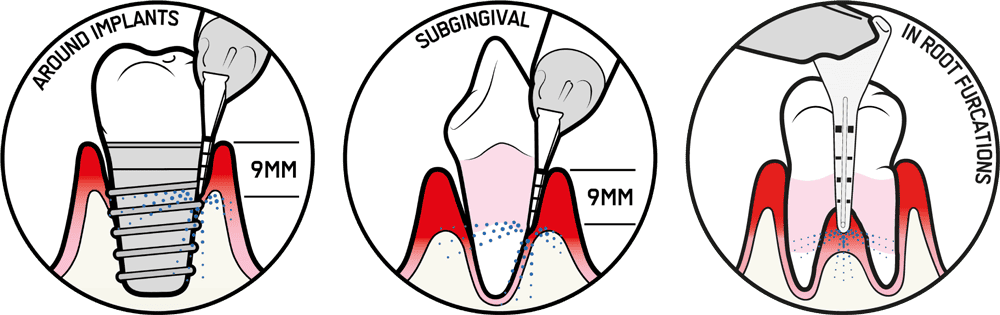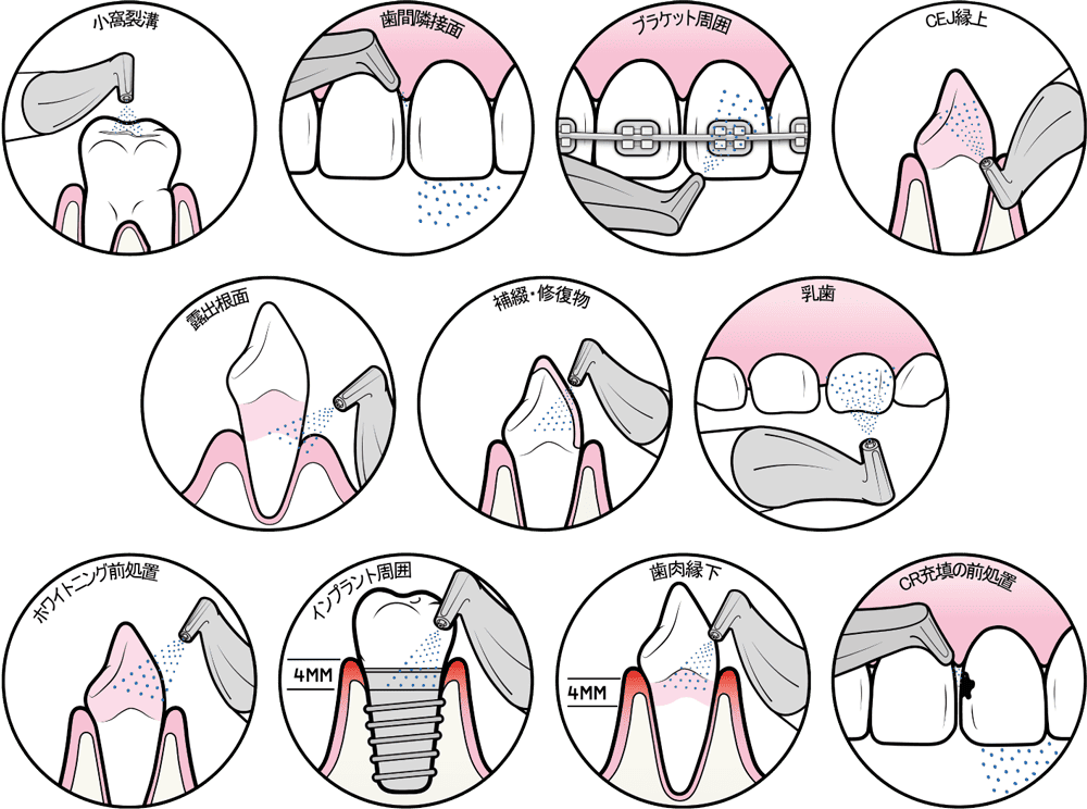 水溶性の微粒子パウダーにより、歯茎などの軟組織に当てても痛くなく、口の中に粉っぽさが残らない。